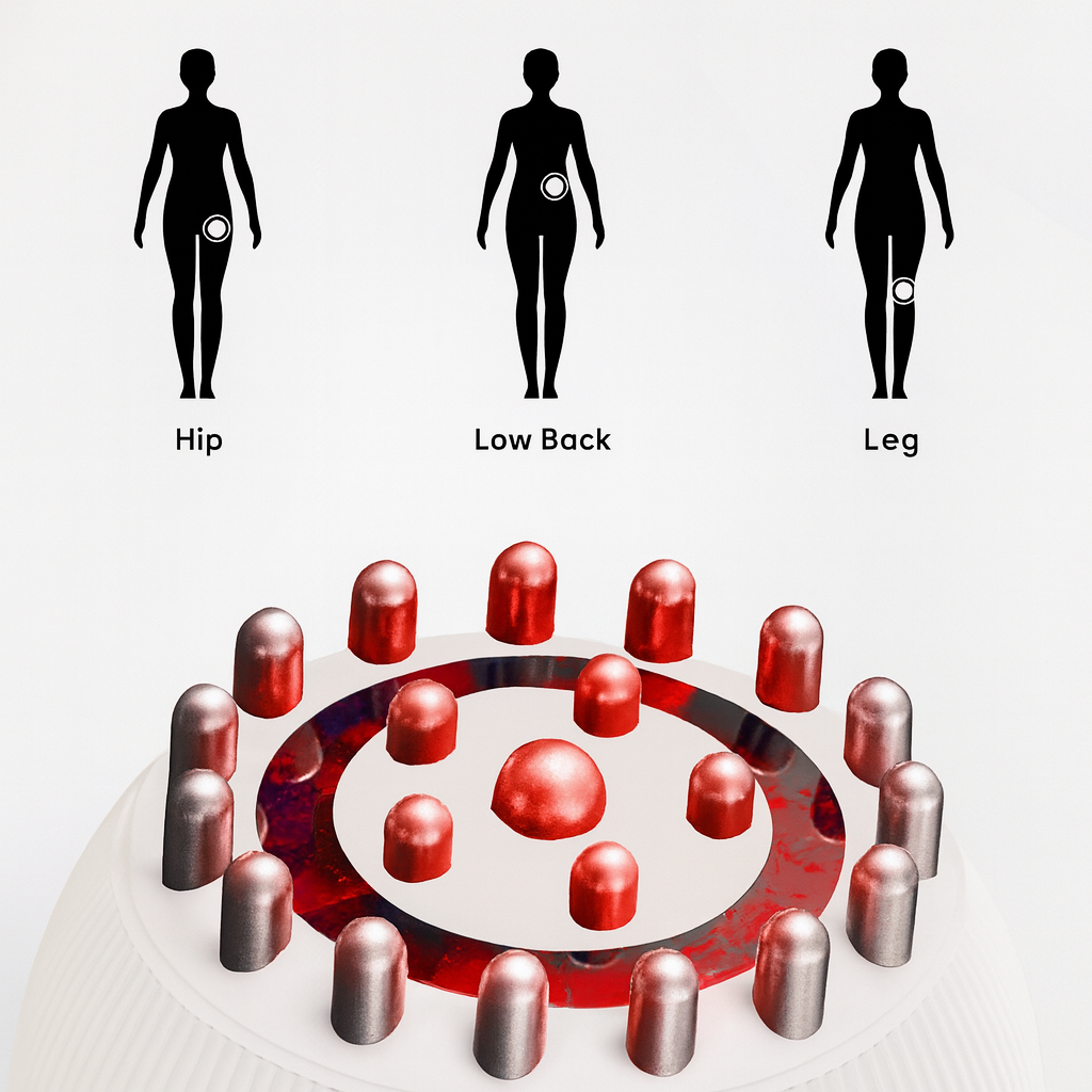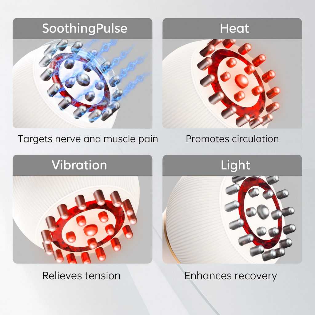 Experience the power of SoothingPulse, Heat, Vibration, and Light technologies working in harmony to relieve pain, improve circulation, reduce muscle tension, and enhance recovery — all in one compact device.